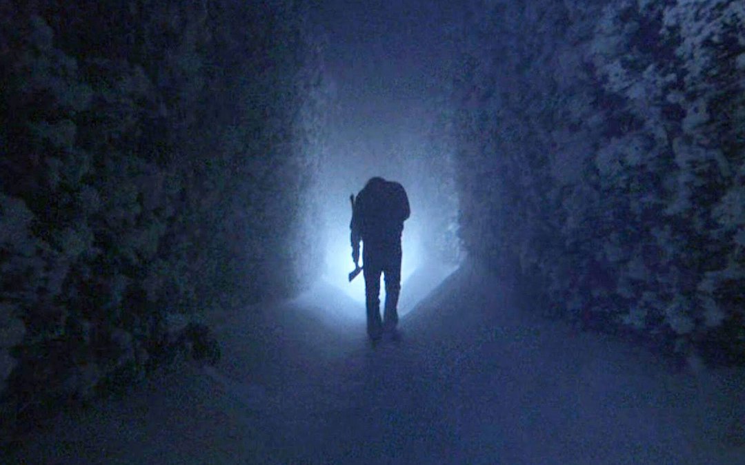 One of the clearest illustrations of winter’s psychological power appears in the hedge-maze chase in The Shining, a scene that distills the logic of snowbound horror. As Jack staggers through the maze in pursuit of Danny, the night snowstorm creates near-whiteout conditions that muffle sound and obscure the paths ahead. The environment becomes a labyrinth of identical turns, transforming Jack’s pursuit into aimless wandering. Danny recognizes that the snow preserves footprints, and he uses this to his advantage by retracing his steps and brushing away the tracks behind him. The maze becomes a landscape that can be rewritten, and Danny manipulates the environment’s distortive qualities to craft an escape route invisible to his pursuer. Jack, overwhelmed by disorientation and rage, succumbs to whiteout dissociation as he circles blindly through the maze, unable to interpret the space or his own movement within it. His eventual death is not simply the result of cold exposure but of his inability to adapt psychologically to the environment’s demands. This scene encapsulates the core of winter horror: survival does not belong to the strongest figure, but to the one most capable of reading a world that refuses to offer stable meaning.