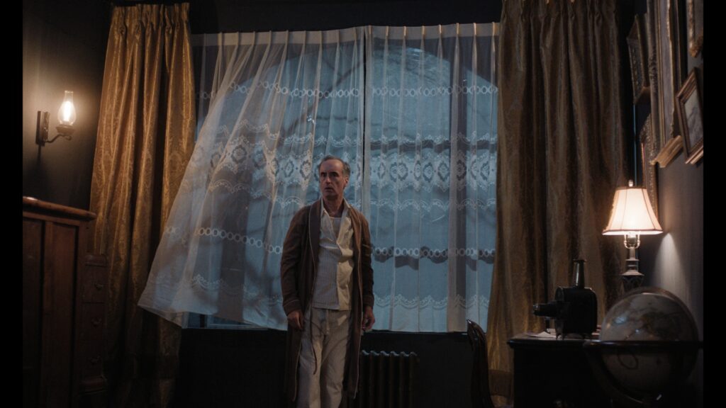 One of the most compelling aspects of Janisse’s film is how it explicitly aligns itself with the tradition of Christmas ghost stories, a subject she explored in her documentary Woodlands Dark and Days Bewitched: A History of Folk Horror. In that film, she remarks on the long-standing connection between the winter solstice and the supernatural: the dark months were believed to be times when the dead visited, when spirits wandered, and when fireside tales reminded communities of mortality, morality, and mystery. Her adaptation of “The Occupant of the Room” feels like a direct extension of that idea as she presents a curated return to the kinds of narratives once shared as families gathered indoors against the cold. Janisse doesn’t modernize the story with flashy effects or rapid pacing; she honors its slowness, its echoing stillness, its lingering dread. By doing so, she positions the short not just as an adaptation of Blackwood, but as a deliberate act of cultural memory, a way of re-inviting ghosts back into the holiday season where they once belonged.