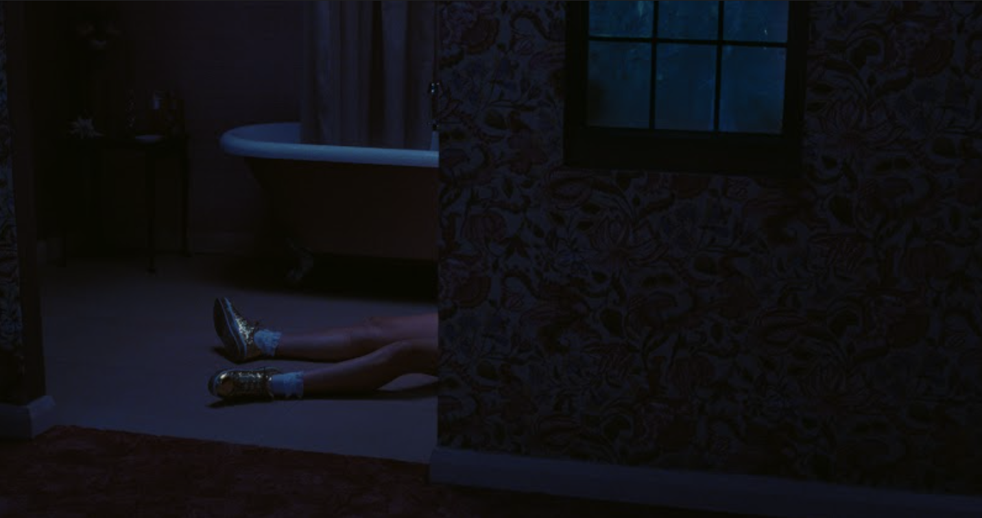 That collapse takes shape in the film’s stunning and unsettling camera work. In moments of distress, the camera doesn’t just observe Rose, but it fragments her. It lingers on isolated body parts: her legs trembling in stirrups, her stomach under clinical lights, her bruised arms held too tightly. The framing deliberately avoids showing her full body during these scenes of medical and sexual trauma, as though her sense of self has been forcibly dismantled, and the effect is chilling. Rose’s consciousness splinters from her form, as if trying to escape the memories of forced sterilization or birthing procedures she never consented to. We’re not just witnessing her disassociate, but we’re being pulled into that dissociation with her. After fleeing her boyfriend’s home and acquiring an abortion pill, Rose checks into the Crown Inn, which is a surreal, hyperfeminine hotel where time and identity seem to dissolve.